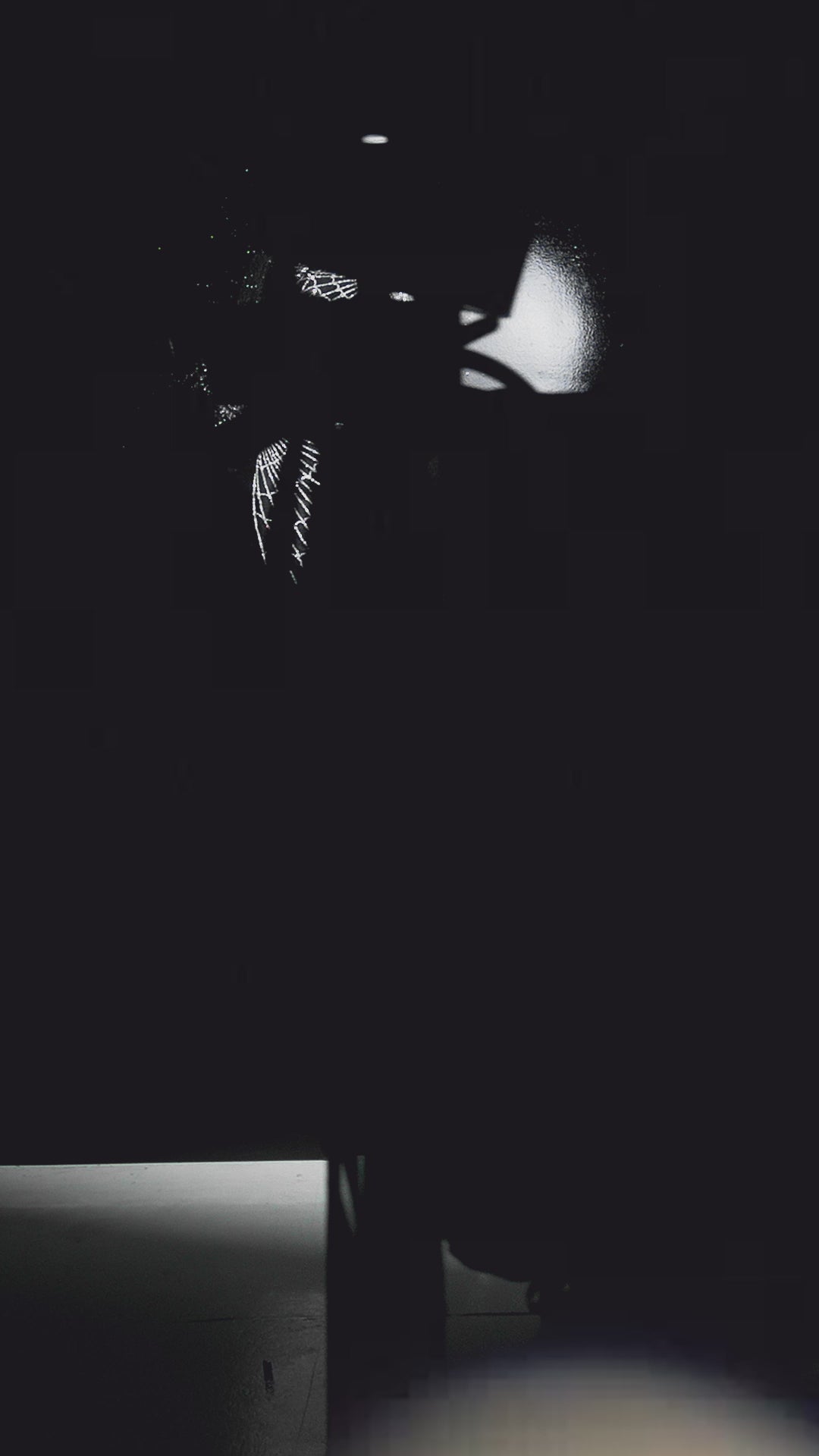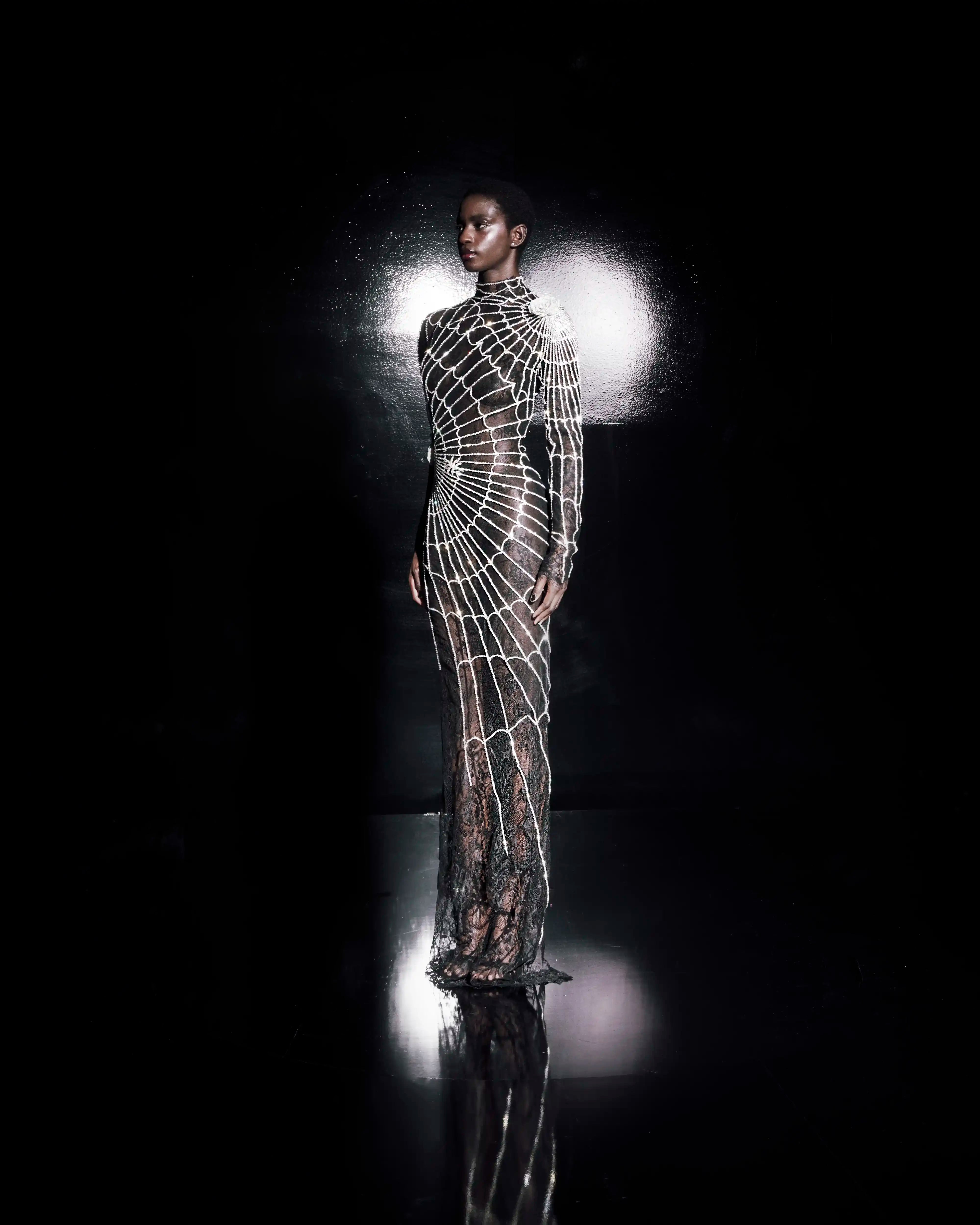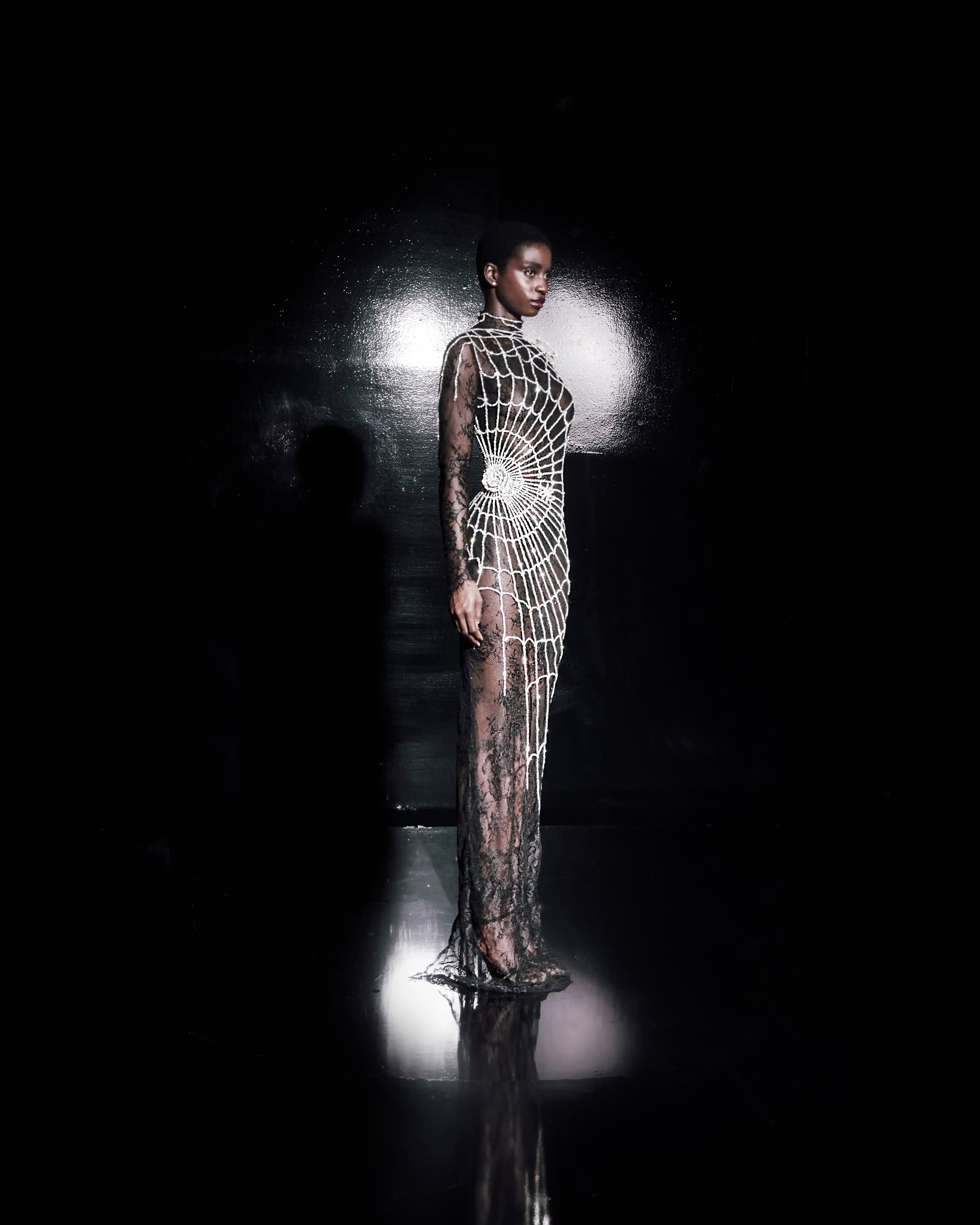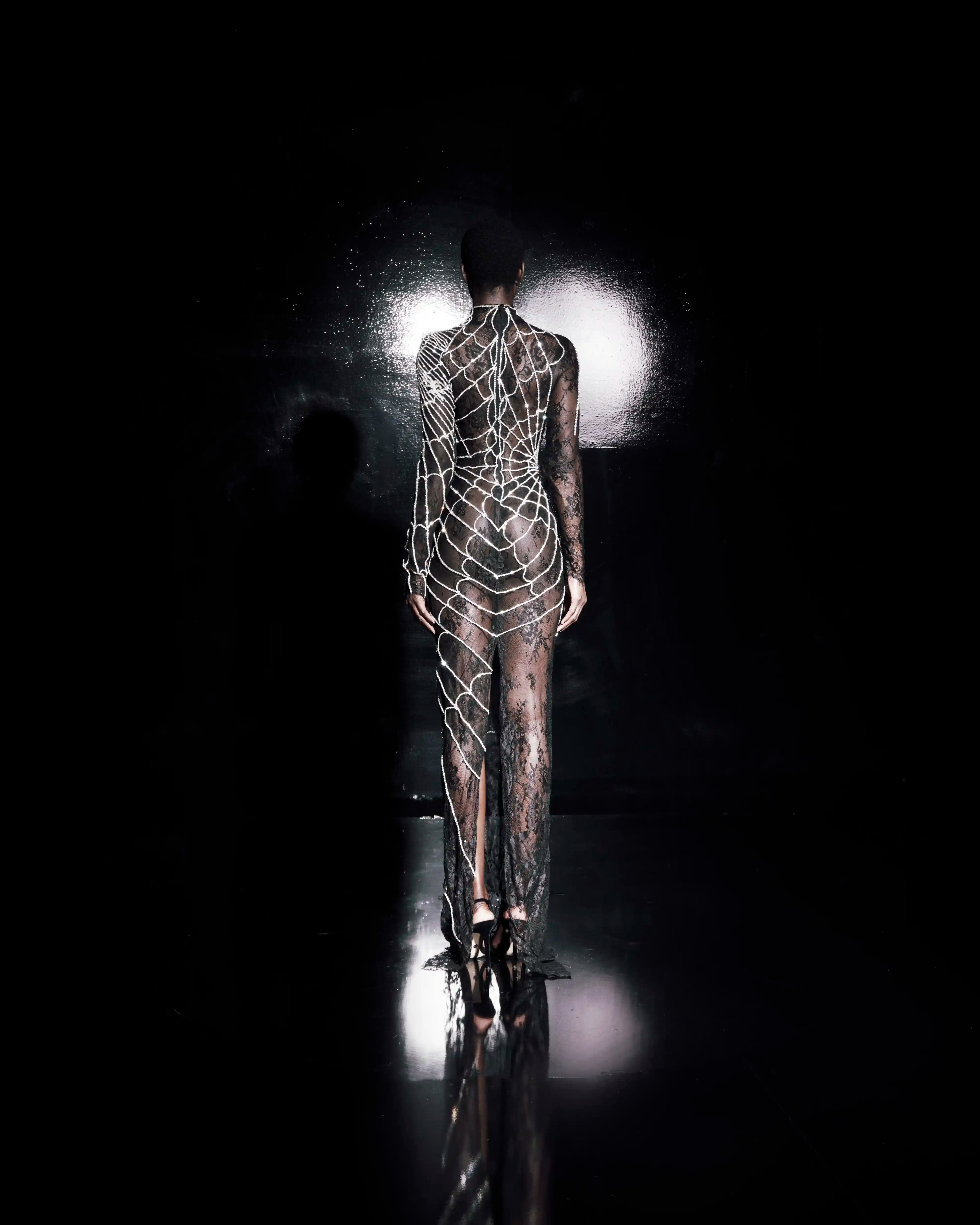 Semi-Transparent Black Dress with Cascading Silver Rhinestones in Web Pattern