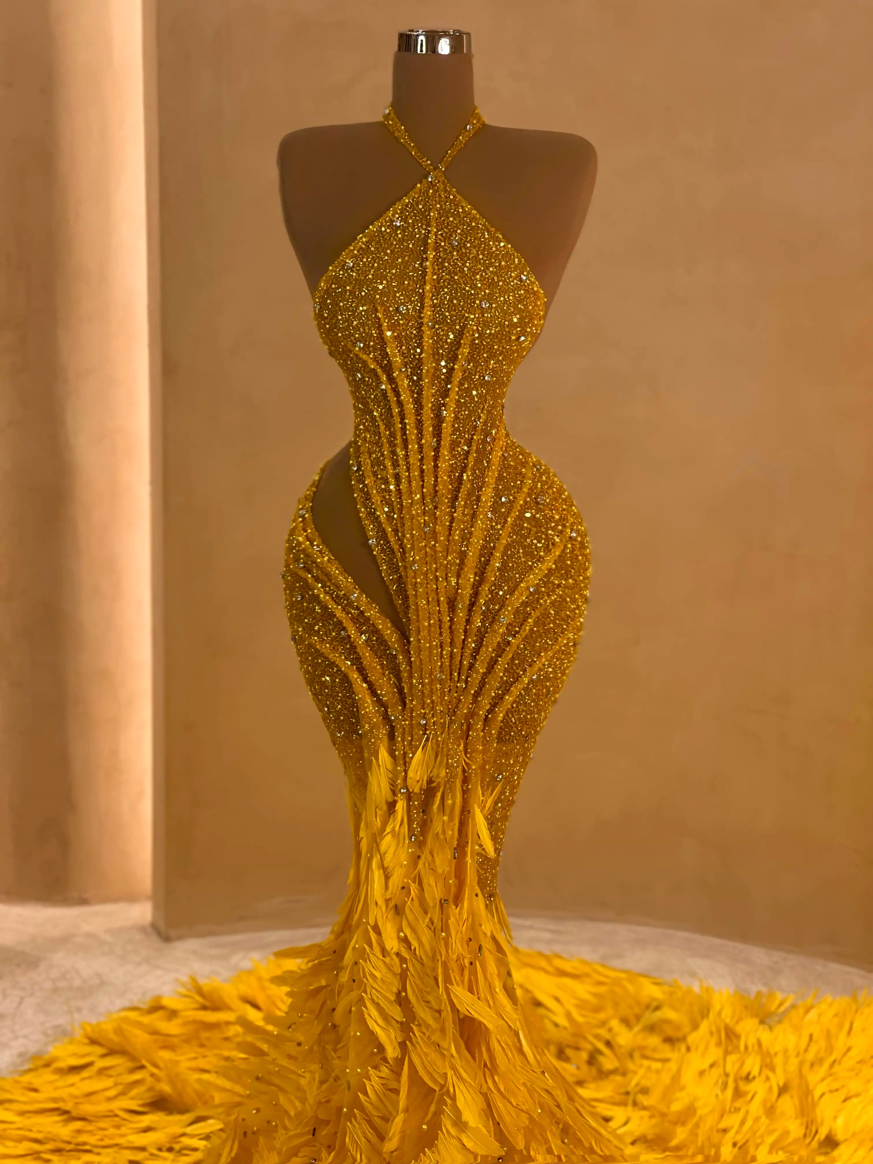 Turn up the radiance in this golden yellow gown adorned with intricate beading and a sculpted mermaid silhouette. The dramatic feathered hem and halter neckline create a look that is bold, elegant, and unforgettable.